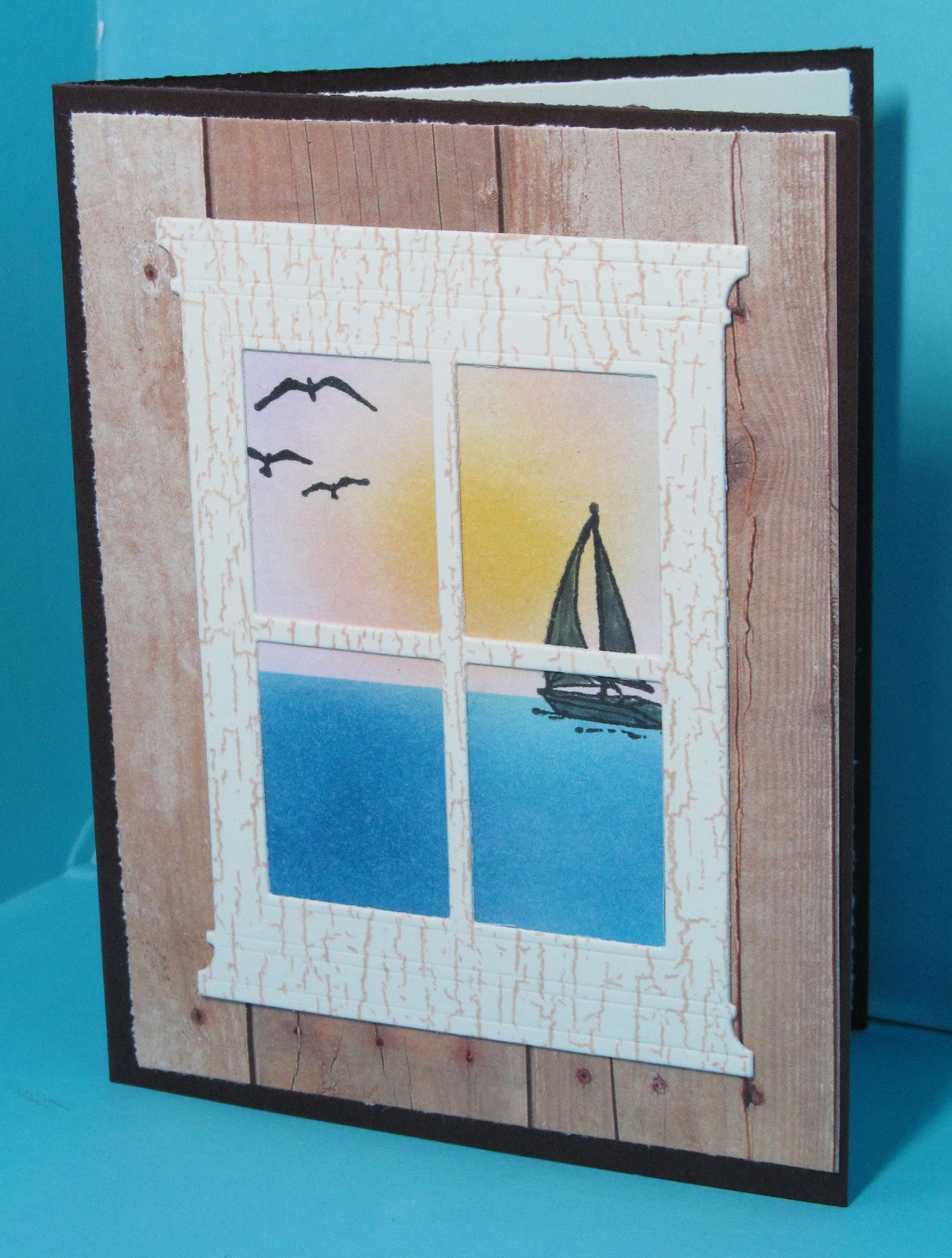 I am absolutely loving creating window scenes with this window die - it is so easy. I sponged the background water and sunset with momento ink then stamped the boat and seal gulls in black. The boat is colored in dark grey to give the silhouette look. For the window frame itself, I used my wood grain stamp then cut out the window. I really love how this turned out!
